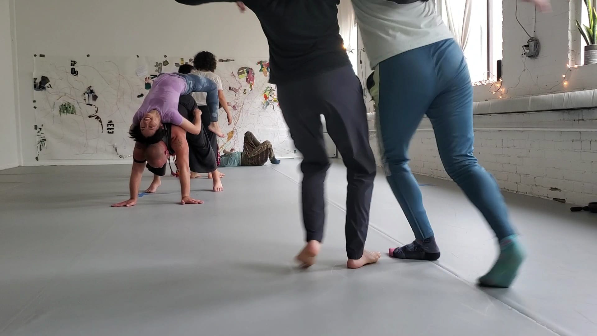 The Underscore, a long-form dance improvisation structure created by Nancy Stark Smith, incorporates Contact Improvisation (CI) into the broader arena of improvisational dance practice. Global Underscore (GUS) centers around a yearly event in which the Underscore is practiced simultaneously for a 4-hour period by people all over the world near the summer solstice (northern hemisphere). (from https://globalunderscore.com) A practitioner of the Underscore since 2017, I have served as a site coordinator/facilitator in Providence and New Haven.